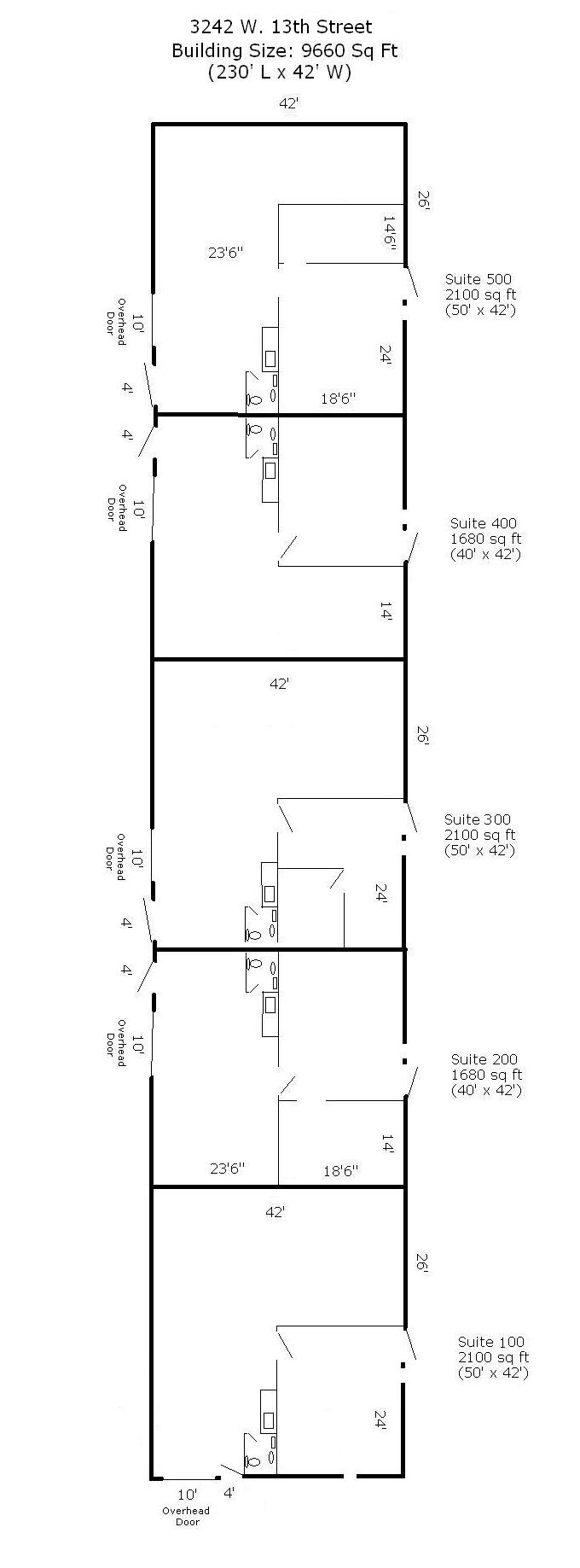3242 & 3246 W 13th Street, Wichita, KS 67203 Telephone: (316) 945-4488 3242 W 13th Street Wichita, KS 67203 Property Description: General Purpose facility consisting of one 9,660 square foot metal building. Located one mile east of 13th & West on 13th for easy access to major roadways. Zoning is Office/Warehouse with a completion date in June of 2000. Space Available: Suite 100 - 2,100 sq ft. - Leased Suite 200 - 1,680 sq ft. - (744 sq ft Office) Leased Suite 300 - 2,100 sq ft. - Leased Suite 400 - 1,680 sq ft. - Leased Suite 500 - 2,100 sq ft. - (800 sq ft Office) Leased Description: Drive-In Overhead Door (10x10) Drive Through Access from 13th Street or Sheridan Warehouse has 14 foot eve height - fully insulated and heated 3 Phase Electrical Large ADA Restroom Front Door Parking Office area 500 sq ft. with HVAC - Carpet – 9 ft Insulated Ceiling/Walls Security System Installed - Lighted perimeter and parking lot Pre-Wired for Telephone, Cable or DSL, Office Cubicles Break area with counter space and oak cabinets Lighted Sign on 13th Street and above Suite entrance Lease Price: Suite 100 - Leased Suite 200 - Leased Suite 300 - Leased Suite 400 - Leased Suite 500 - Leased Lessee pays utilities, increases in real estate taxes, fire/casualty insurance, common area maintenance, pest control, and alarm monitoring. Lessor pays taxes, insurance.